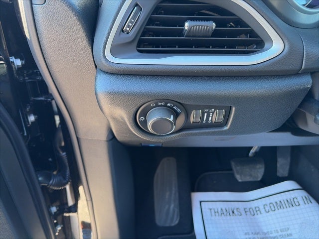 Quick Order Package 27E, 17 x 7 Aluminum Wheels, 3.25 Axle Ratio, 3rd row seats: split-bench, 4-Wheel Disc Brakes, 6 Speakers, ABS brakes, Air Conditioning, Alloy wheels, AM/FM radio: SiriusXM, Apple CarPlay/Android Auto, Automatic temperature control, Black Seats, Brake assist, Bumpers: body-color, Caprice Leatherette Bucket Seats, Compass, Delay-off headlights, Driver door bin, Driver vanity mirror, Driver's Seat Mounted Armrest, Dual front impact airbags, Dual front side impact airbags, Electronic Stability Control, Emergency communication system: Chrysler Connect, Four wheel independent suspension, Front anti-roll bar, Front Bucket Seats, Front dual zone A/C, Front reading lights, Fully automatic headlights, Heated door mirrors, Heated front seats, Heated steering wheel, Illuminated entry, Knee airbag, Low tire pressure warning, Occupant sensing airbag, Outside temperature display, Overhead airbag, Overhead console, Panic alarm, ParkView Rear Back-Up Camera, Passenger door bin, Passenger seat mounted armrest, Passenger vanity mirror, Power door mirrors, Power driver seat, Power Liftgate, Power steering, Power windows, Radio data system, Radio: Uconnect 5 with 10.1 Display, Rain sensing wipers, Rear air conditioning, Rear window defroster, Rear window wiper, Reclining 3rd row seat, Remote keyless entry, Security system, Speed control, Split folding rear seat, Spoiler, Steering wheel mounted audio controls, Tachometer, Telescoping steering wheel, Tilt steering wheel, Touring Suspension, Traction control, Trip computer, Turn signal indicator mirrors, Variably intermittent wipers, and Voltmeter. 19/28 City/Highway MPG