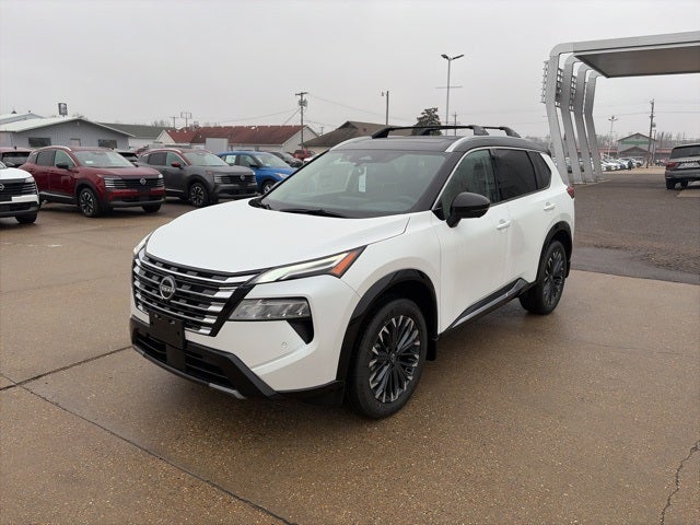 ** Alloy Wheels / Premium Wheels, ** Bluetooth®, Hands Free, ** Cruise Control, ** Keyless Entry, ** Premium Sound System / Premium Audio, ** Satellite Radio, ** Steering Wheel Controls, AWD, 10 Speakers, 4-Wheel Disc Brakes, ABS brakes, Air Conditioning, Alloy wheels, AM/FM radio: SiriusXM w/360L, Auto High-beam Headlights, Auto-dimming Rear-View mirror, Automatic temperature control, Bose Premium Audio System, Brake assist, Bumpers: body-color, Delay-off headlights, Driver door bin, Driver vanity mirror, Dual front impact airbags, Dual front side impact airbags, Electronic Stability Control, Emergency communication system: NissanConnect Services, Four wheel independent suspension, Front anti-roll bar, Front Bucket Seats, Front Center Armrest, Front dual zone A/C, Front reading lights, Fully automatic headlights, Garage door transmitter: myQ Connected Garage, Heads-Up Display, Heated door mirrors, Heated Front Bucket Seats, Heated front seats, Heated steering wheel, Illuminated entry, Knee airbag, Low tire pressure warning, Memory seat, Navigation system: Google Maps, Occupant sensing airbag, Outside temperature display, Overhead airbag, Overhead console, Panic alarm, Passenger door bin, Passenger vanity mirror, Power door mirrors, Power driver seat, Power Liftgate, Power moonroof, Power passenger seat, Power steering, Power windows, Quilted Semi-Aniline Leather-Appointed Seat Trim, Radio data system, Radio: AM/FM NissanConnect with Navigation, Rear anti-roll bar, Rear reading lights, Rear seat center armrest, Rear side impact airbag, Rear window defroster, Rear window wiper, Remote keyless entry, Security system, Speed control, Speed-sensing steering, Speed-Sensitive Wipers, Split folding rear seat, Spoiler, Steering wheel mounted audio controls, Tachometer, Telescoping steering wheel, Tilt steering wheel, Traction control, Trip computer, Turn signal indicator mirrors, Variably intermittent wipers, Wheels: 19 Unique Dark Painted Aluminum Alloy, Wireless Apple CarPlay/Wireless Android Auto, AWD. Everest White Pearl/Super Black 2026 Nissan Rogue Platinum AWD CVT with Xtronic 1.5L DOHC