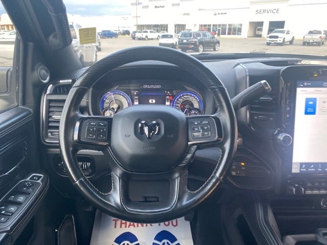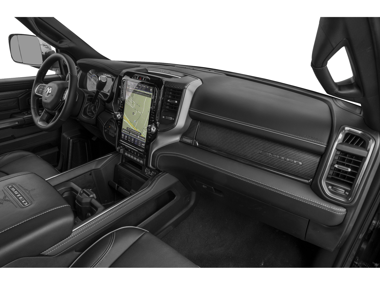 ** Alloy Wheels / Premium Wheels, ** Apple CarPlay/Android Auto, ** Bluetooth®, Hands Free, ** Premium Sound System / Premium Audio, ** Stability Control, ** USB Port, 10 Speakers, 12 Touchscreen Display, 17 Speaker harman kardon Premium Sound, 220 Amp Alternator, 3.73 Axle Ratio, 4-Wheel Disc Brakes, 4G LTE Wi-Fi Hot Spot, ABS brakes, Active Noise Control System, Adaptive Cruise Control w/Stop, Adaptive Steering System, Adjustable pedals, Air Conditioning, Air Suspension Decal, Alloy wheels, AM/FM radio: SiriusXM with 360L, Apple CarPlay, Apple CarPlay/Android Auto, Audio memory, Auto High-beam Headlights, Auto Level Rear Air Suspension, Auto-dimming Rear-View mirror, Automatic temperature control, Black Exterior Mirrors, Black Exterior Truck Badging, Black Grille Limited, Black Headlamp Bezels, Black Ram Head Tailgate Badge, Black Tail Lamp Bezels, Black Wheel Center Hub, Body Color Door Handles, Body Color Grille Surround, Bodyside moldings, Brake assist, Bumpers: chrome, Clearance Lamps, Compass, Connected Travel & Traffic Services, Connectivity - US/Canada, CTR Stop Lamp w/Cargo View Camera, Dash Pass Thru Wire Circuits, Delay-off headlights, Digital Rearview Mirror, Disassociated Touchscreen Display, Driver door bin, Driver vanity mirror, Dual Alternators Rated At 440 Amps, Dual front impact airbags, Dual front side impact airbags, Electronic Stability Control, Electronically Controlled Throttle, Exterior Mirrors Courtesy Lamps, Exterior Mirrors w/Heating Element, Exterior Mirrors w/Memory, Exterior Mirrors w/Supplemental Signals, Front anti-roll bar, Front Bucket Seats, Front Center Armrest w/Storage, Front dual zone A/C, Front fog lights, Front License Plate Bracket, Front reading lights, Full Speed Forward Collision Warning Plus, Fully automatic headlights, Garage door transmitter, Genuine wood console insert, Genuine wood dashboard insert, Genuine wood door panel insert, Global Telematics Box Module (TBM), Google Android Auto, GPS Antenna Input, GPS Navigation, HD Radio, Heated door mirrors, Heated front seats, Heated rear seats, Heated steering wheel, I/P Mounted Auxiliary Switches, Illuminated entry, Integrated Voice Command w/Bluetooth®, Lane Keep Assist, Leather steering wheel, Limited Leather Bucket Seats, Limited Level 1 Equipment Group, Low tire pressure warning, Memory seat, Mirror Running Lights, Mirror-Mounted Aux Reverse Lamps, MOPAR Deployable Bed Step, Navigation System, Night Edition, Occupant sensing airbag, Off-Road Information Pages, Outside temperature display, Overhead airbag, Overhead console, Painted Flat Wheel-to-Wheel Side Steps (DISC), Painted Front Bumper, Painted Rear Bumper, Panic alarm, ParkView Rear Back-Up Camera, Passenger door bin, Passenger vanity mirror, Pedal memory, Power Adjustable Convex Aux Mirrors, Power Black Tow Mirrors w/Convex Spotter & Memory, Power door mirrors, Power driver seat, Power passenger seat, Power steering, Power windows, Power-Folding Mirrors, Protection Group, Quick Order Package 21M Limited, Radio data system, Radio: Uconnect 5 Nav w/12.0 Display, Rain sensing wipers, Rear reading lights, Rear seat center armrest, Rear step bumper, Rear window defroster, Remote keyless entry, Security system, Selectable Tire Fill Alert, SiriusXM w/360L, Speed control, Split folding rear seat, Steering wheel mounted audio controls, Surround View Camera System, Tachometer, Tilt steering wheel, Tip Start, Tow Hooks, Traction control, Trailer Reverse Guidance, Trailer Surround View Camera System (DISC), Trailer Tow Mirrors, Trip computer, Turn signal indicator mirrors, Upfitter Electronic Module (VSIM), Variably intermittent wipers, Vendor Painted Cargo Box, Vendor Painted Cargo Box Tracking, Ventilated front seats, Voltmeter, Wheels: 20 x 8.0 Cast Aluminum Black, Wheels: 20 x 8.0 Satin Carbon w/Chrome Insert.